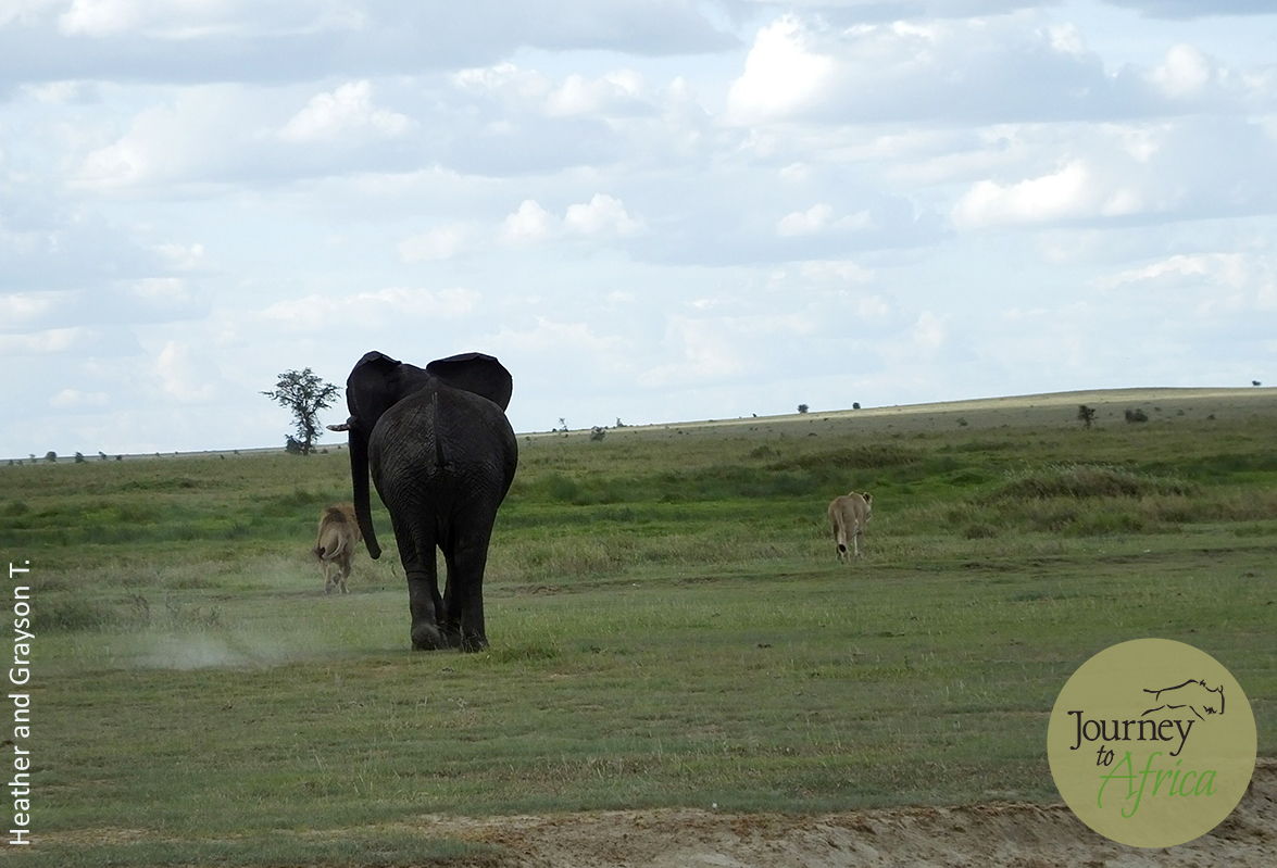 “Here she comes.” “She’s scooting them away.” “Oh watch out lions. Don’t make her angry” “What, moving in again” “Go get them mama elephant.” “Oh, the look of defeat.” “Better luck next time.” “No, pick another animal.” “She was so scared, she pissed in her ….”